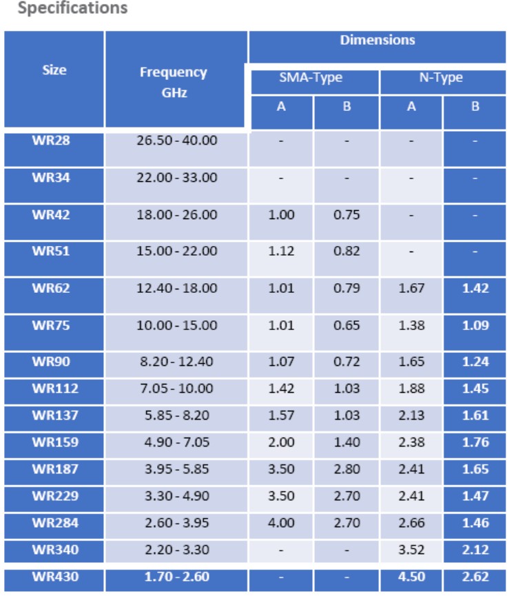 WR340 | 2.20 - 3.30 | • | • | • | • | • | 121-340-N-F-CPR-TX | link | N | 3" X 3" | ||