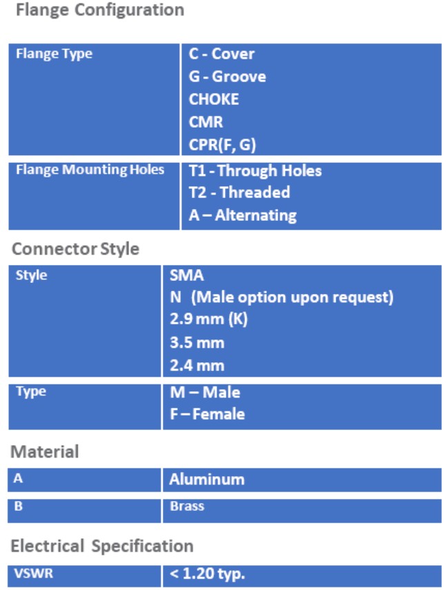 UBS offers a standard product line of precision rectangular waveguide-to-coax end launch adapters covering waveguide sizes fromWR-22 throughWR-650.