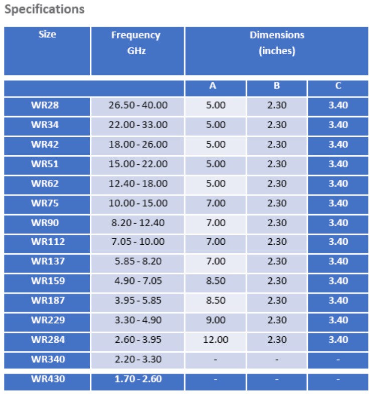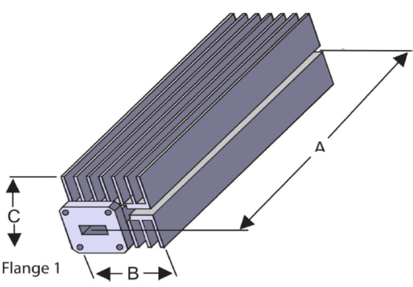 Part Description UBS’ standard product line of medium power terminations is constructed of normal wall waveguide tubing and extruded heat sink material. The load elements are custom-ground silicon carbide spears tapered for an optimum VSWR response of 1.10 max. Maximum power handling capacity: 25 watts for waveguide sizesWR-28 toWR-62, 50 watts for waveguide sizes WR-75 to WR-430.